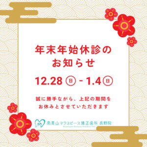 news 2025.12.20 🎍年末年始 休診のお知らせ🎍 誠に勝手ながら12月28日(日)〜1月4日(日)まで 休診とさせていただきます。 また、12月27日(土)は15:00までの診療となっております。 来年は1月5日(月)から通常診療いたします。 来年もご愛顧のほどよろしくお願いいたします。 ️医療法人雅会_南青山マウスピース矯正歯科 長野院 facebook Line twitter google